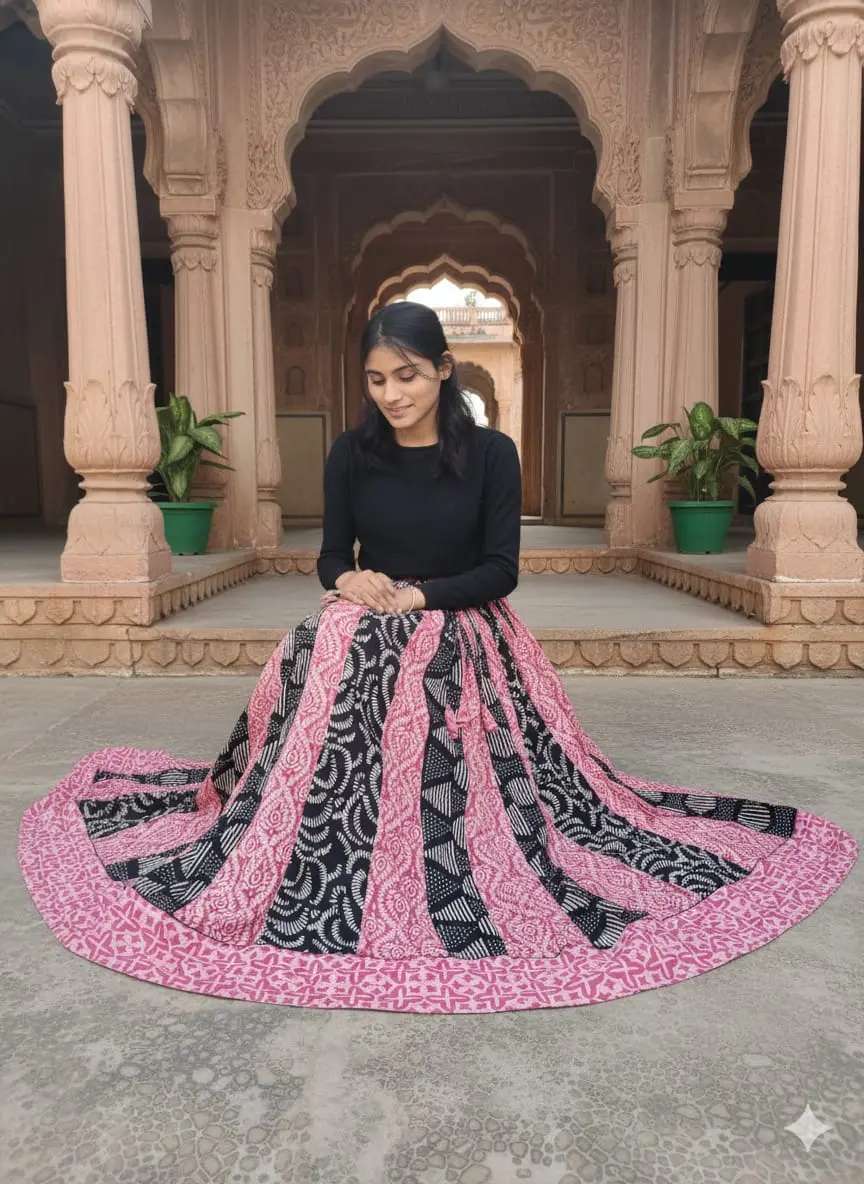 With a graceful 5.5 meter circular flare and 40-inch length, this designer cotton long skirt for women creates a beautiful flow and elegant silhouette. Perfect for casual wear, festive occasions, and boho or Indo-western styling.