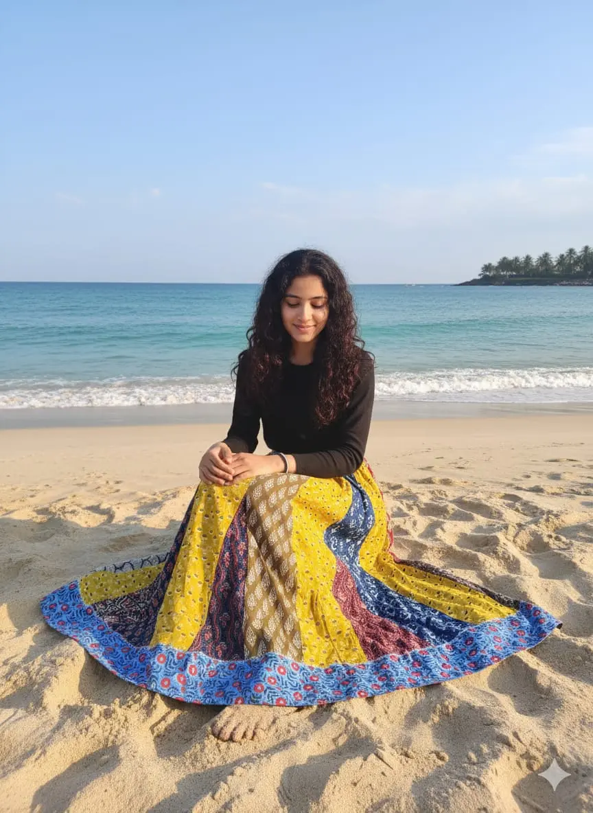 With a graceful 5.5 meter circular flare and 40-inch length, this designer cotton long skirt for women creates a beautiful flow and elegant silhouette. Perfect for casual wear, festive occasions, and boho or Indo-western styling.
