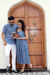 Blue Cotton handblock print couple twinning outfit, crafted for comfort and style. A perfect readymade dress for gifting and special occasions.