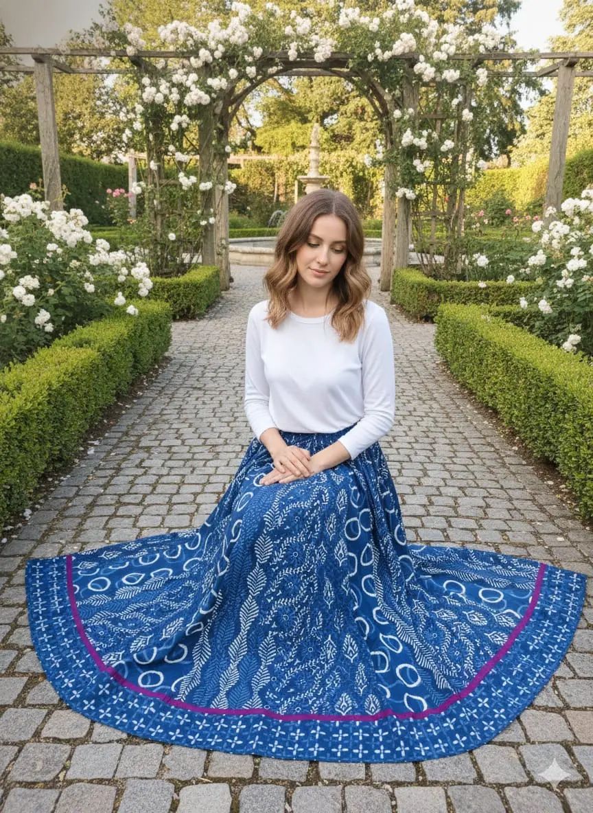 With a graceful 5.5 meter circular flare and 40-inch length, this designer cotton long skirt for women creates a beautiful flow and elegant silhouette. Perfect for casual wear, festive occasions, and boho or Indo-western styling.